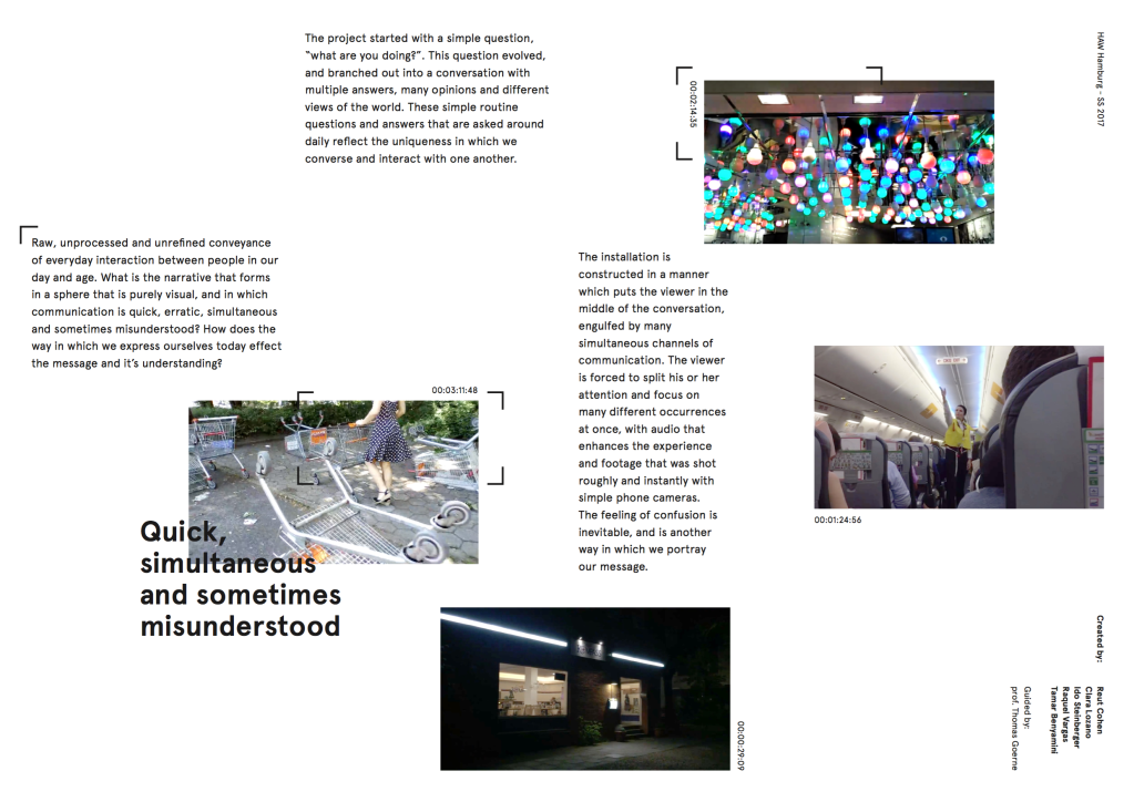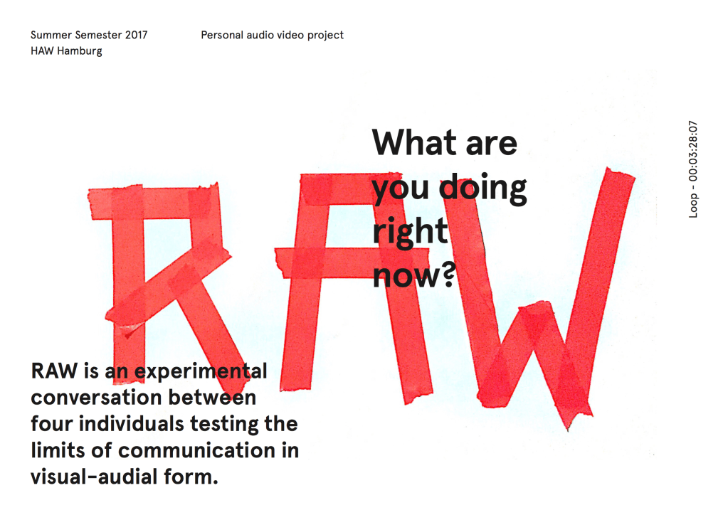 This is a sketch of the video installation RAW, which was exhibited during Rundgang 2017 at HAW Hamburg Campus Finkenau. The installation consisted of four screens shaping a square and the visitor had to stand in the centre and interact with the images and sounds, so that to create the «FOMO» feeling. Each screen represents one person of the group, and the continuity of images, a whatsapp conversation between each other built from videos recorded with camera phones.